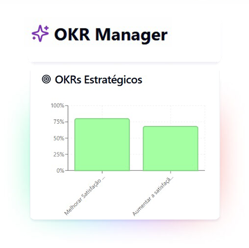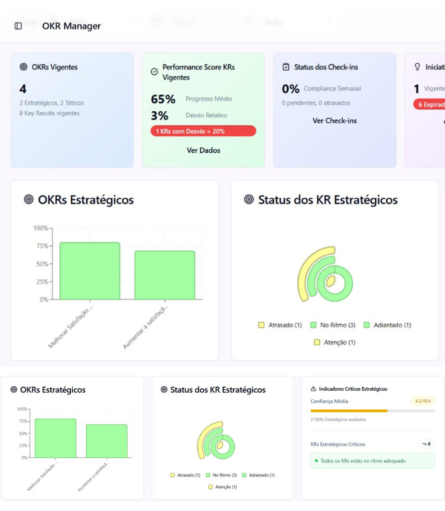 Usamos um workshop rápido de Planejamento & Execução com a metodologia OKR, com os Gestores e líderes de área para aplicar a metodologia e sair com poucos OKRs de alto impacto e KRs mensuráveis. Tudo registrado na Plataforma OKR Manager para revisões objetivas e baseadas em dados.